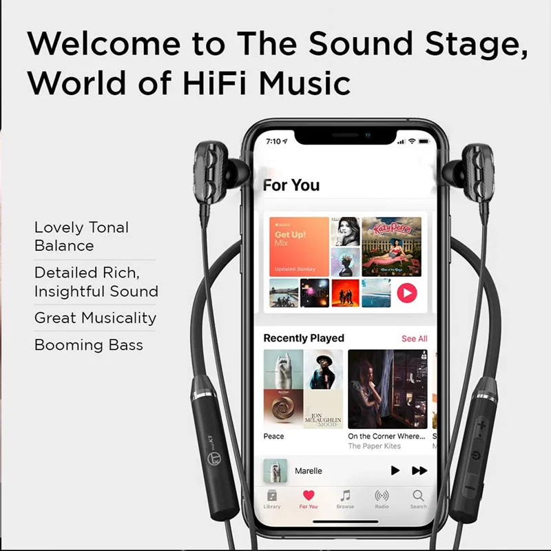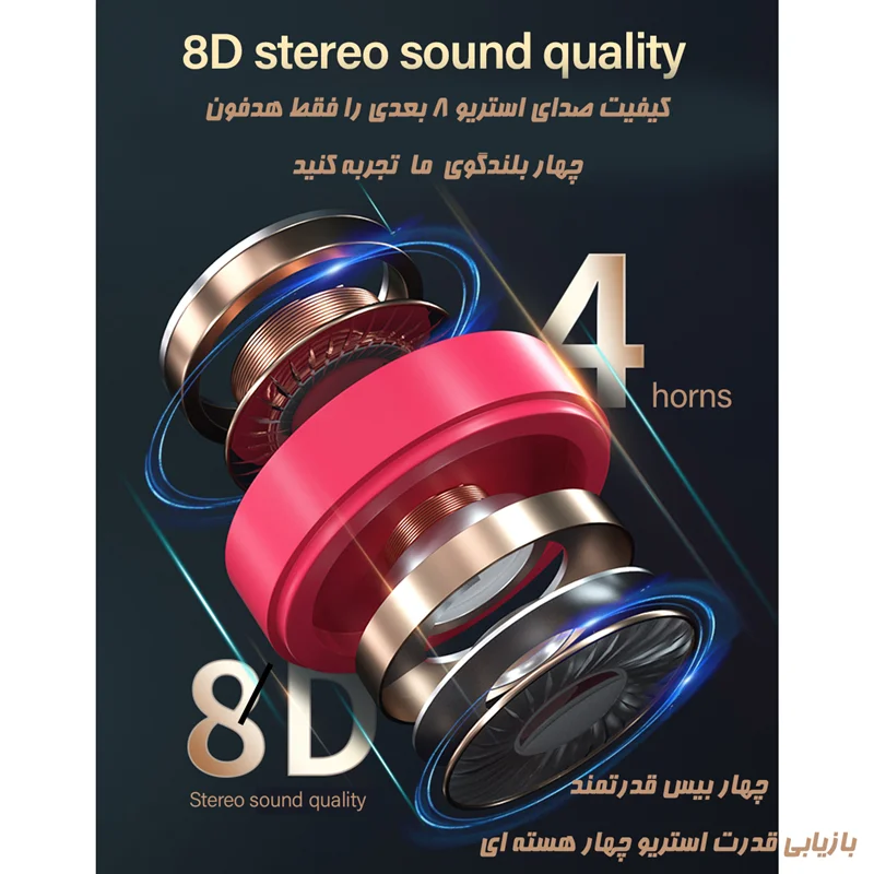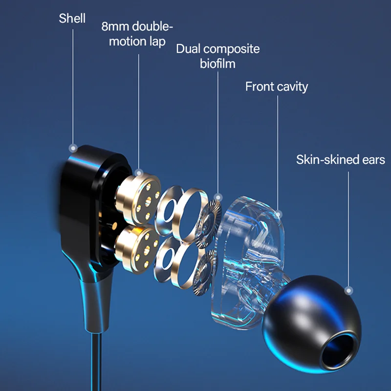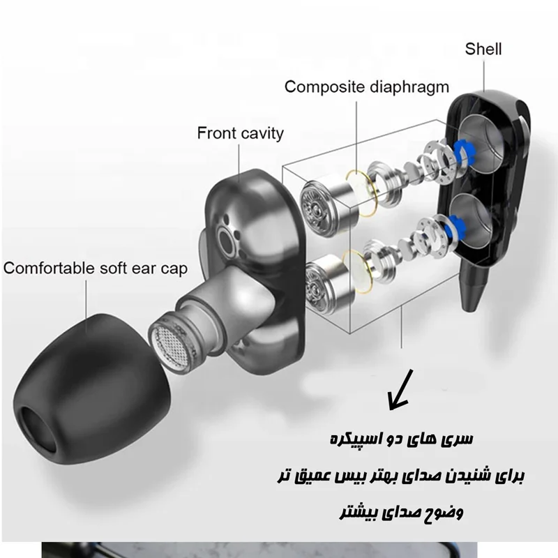 این هندزفری دارای دو اسپیکر در هر طرف برای تفکیک کامل صدا و بیس بهتر می باشد همچنین در شنیدن موسیقی فرکانس های بالا و پایین را هم جهت کرده و باعث میشود در شنیدن موسیقی با صدای بالا صداها تداخل پیدا نکنند و تفکیک صدا کاملا حفظ شود.قابلیت ایزولهسازی صدا نیز برای شنیدن صدا در محیطهای شلوغ نیز کاربرد دارد. واحد درایور داینامیک 10mm و طراحی حرفه ای آکوستیک باعث می شود تا فیلد صدا باکیفیت به داخل گوش منتقل شود. این ساختار، سیگنال بسیار با کیفیت، باس قدرتمند و شفافیت بالا همراه با صدای استریو را را ایجاد می کند.همچنین به علت درایور 10MM باعث شنیده شدن بیس عمیقتر و صدای شفافتر با قابلیت HIFI میتوانید ساعت ها از شنیدن موسیقی لذت ببرید.