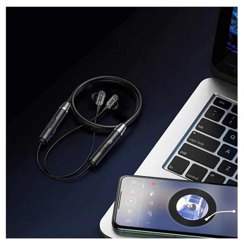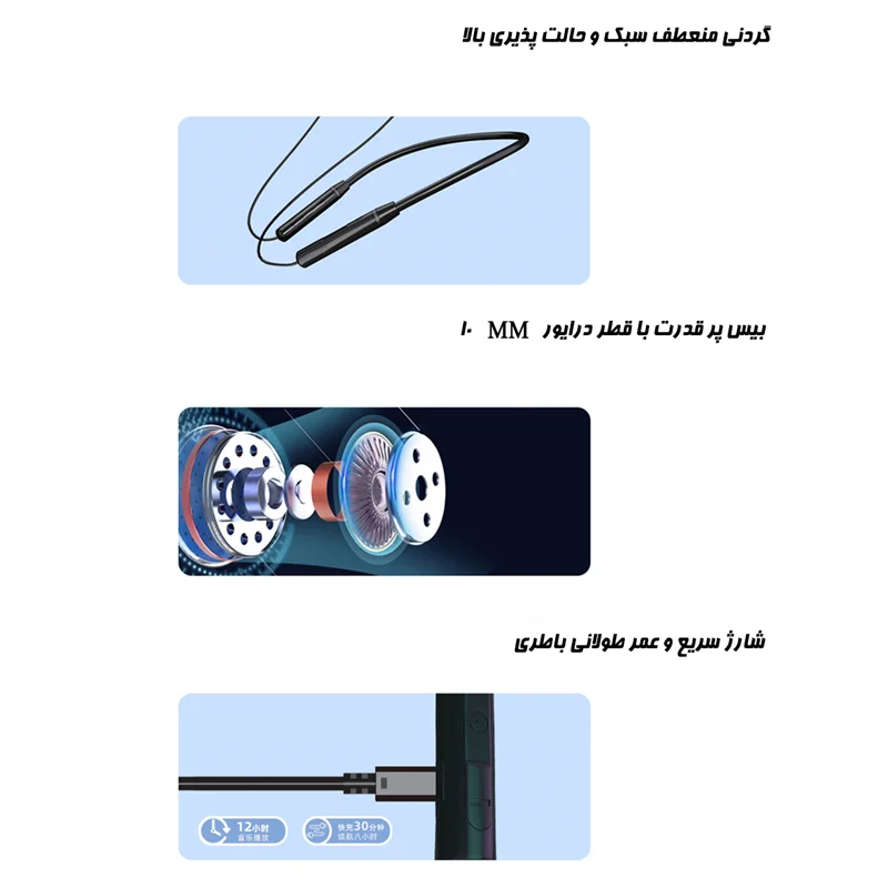 ساختار خارجی هدفونها نیز طوری طراحی شده است که با ارگونومی گوش ها کاملا سازگار باشدو برای افرادی که برای ساعت های طولانی از هدفون استفاده میکنند راحت و سبک بدون ایجاد حساسیت باشد .گوشی های هدست، به خوبی داخل گوش فیت شده و سری های سیلیکونی با سایزهای مختلف داخل بسته هدست وجود دارد و کابل آن با وجود انعطاف پذیری بالا به هیچ عنوان به هم گره نمی خورد و احساس یک هندزفری اسپرت و شیک را القا می کند .همچنین هدفون بی سیمsportplusمخصوص علاقه مندان به ورزش که دوست دارند در حال دویدن و یا پیاده روی و ورزشهای پرتحرک دیگر به موسیقی گوش دهند. بند گردنی انعطاف پذیر هدست که می تواند با توجه به اندازه گردن تنظیم شود که به دلیل لوله ی فلزی مگنتی با روکش سیلیکونی که داراست , حالت انعطاف و شکل پذیری بالایی داشته باشد که حتی می توانید انرا به دور مچ دست ببندید.باتری لیتیوم یونی باظرفیت mAh120 قابلیت سریع شارژ شدن را داراست که درکنار بلوتوث ورژن 5 و قابلیت fast charge امکان کم مصرف و عمر بالای باطری را میدهد.روی این هدفون، یک ریموت نیز تعبیه کرده است که یکی از نکات بسیار خوب در رابطه با این ریموت، سازگاری آن با انواع گوشی ها است.این ریموت، دارای سه دکمه است که عملکردهای معمول مانند آغاز / متوقف کردن پخش موسیقی، کم و زیاد کردن حجم صدا، رفتن به آهنگ بعدی و قبلی و پاسخ و رد تماسها را انجام میدهند.